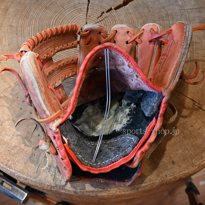 納期は修理(加工)の混雑状況により多少前後いたします。金額は硬式・軟式用など使用する革紐(材料)、修理の方法により異なります。グラブ・ミットの状態によりお受けできない場合(修理不可)もございます。他店での購入品、ネットでの購入品、頂き物などでも修理をお受けしております。遠慮なく相談ください。