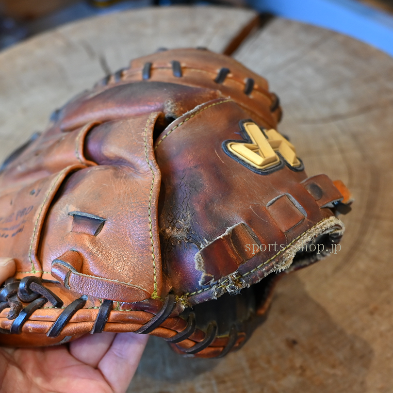高校1年生よりハタケヤマ・硬式用・キャッチャーミットの背面の革の交換依頼です。高校生活の残り1年半ほど、修理をするか新しいのを購入するか悩みどころです。状態は画像の通り、親指掛けが切れている、その周辺の革の劣化、手口部のベルトの破れ、本体の革の破れと劣化、ヘリ革もボロボロの状態でした。お客様と相談して背面の革と平裏の革、ウエブを交換しました。それに伴い、革紐も全交換、内側の芯材の点検と確認、補修、メンテナンスを行いました。